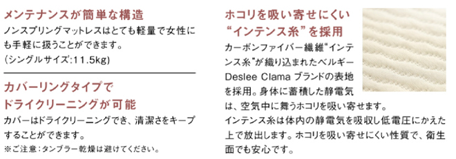 優れた吸放湿性能を持つ5層構造のノンスプリングマットは、寝床内環境を快適に保ちます。