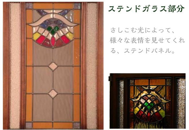 ステンドグラスの彩色とオーク材の木調がお互いをひきたてるデザイン。